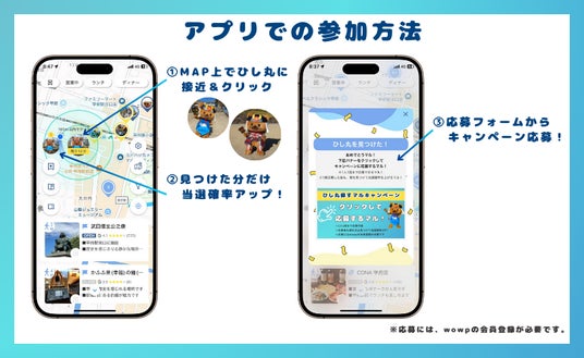 2.「お出かけアプリwowp」のMAPに出現するひし丸に近づいて当選確率UP!!