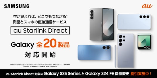 サムスン電子ジャパン株式会社は、最新AIフォン「Samsung Galaxy S25シリーズ」をはじめとするauのSamsung Galaxy全20製品に、2025年4月10日(木)よりKDDI株式会社(以下、au)が提供を開始する日本初※の衛星とauスマートフォンの直接通信サービス「au Starlink Direct」の対応が決定いたしましたのでお知らせいたします。本サービスはauをご利用のお客様へ当面無料で提供され、申し込み不要で本日からご利用いただけます。