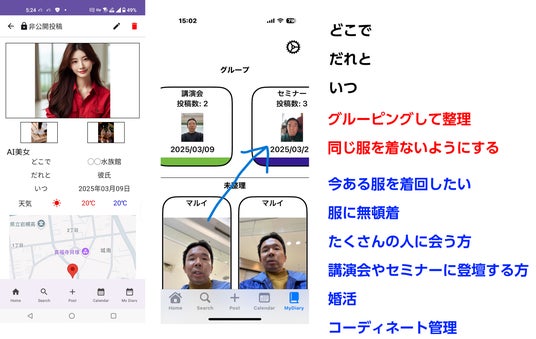 ほかのコーディネートアプリと異なる点は、今の自分の服装を写真に撮り「どこで」「だれと」GPSを用いた場所、メモや感想の登録してグルーピングできることです。