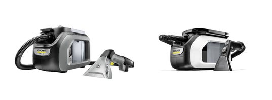 左:業務用カーペットリンスクリーナー「Puzzi 2/1 Bp」 右: 家庭用カーペットリンスクリーナー「SE 3」