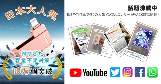 Vackiitの 「Apple MFi認証 」usbメモリは、SNS上で大きな注目を集め、総再生回数が100万回を超えている。この製品が注目されている理由のひとつは、iPhoneユーザーの容量不足を解消し、iCloudの利用料を削減できる点だ。