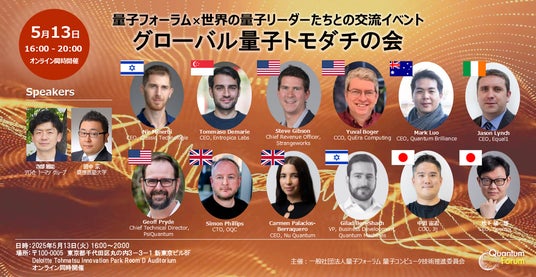 量子技術の健全な発展を支援することを目的としている、一般社団法人量子フォーラム(代表理事:富田章久、所在地:東京都港区)は、世界の量子リーダーたちとカジュアルに交流するイベント『グローバル量子トモダチの会』を開催いたします。本イベントでは、量子技術の最前線で活躍する12名のリーダーが一堂に会し、講演を行います。