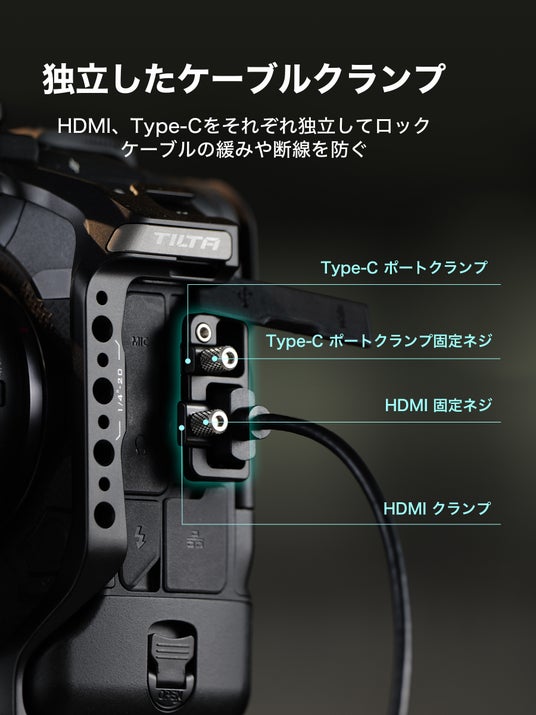HDMI端子とType-C端子には、それぞれ独立設計のケーブルクランプを搭載。移動時や長時間撮影中のケーブルの緩みや断線を防止し、信号の安定性を確保します。