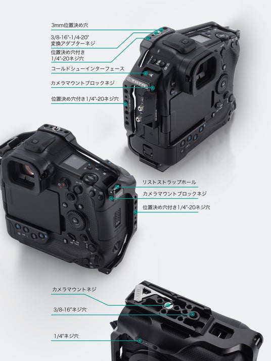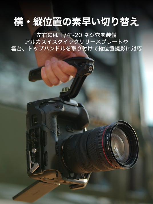 キヤノンのフラッグシップミラーレスカメラ「EOS R1」に完全対応した、プロフェッショナル向けの専用カメラケージが遂に登場。機動力、拡張性、信頼性を追求した本製品は、映像制作の現場で求められるあらゆるニーズに応える革新的な設計が施されています。