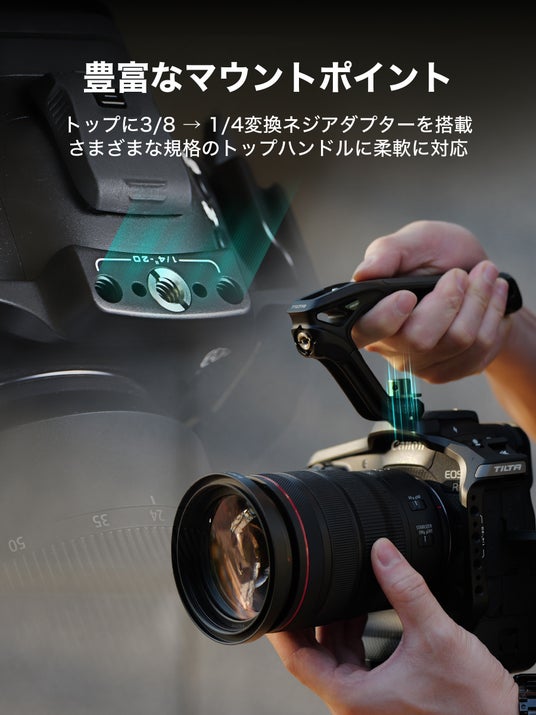 1/4"-20ネジ穴、3/8"-16ネジ穴(位置決めピン対応)など、豊富なマウントポイントを搭載。外部モニター、マイク、ハンドルなど、撮影スタイルに応じた多彩な拡張が可能です。