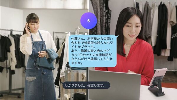 例えば、店頭スタッフが「青いマグカップの入荷はいつになりますか?」と「LINE WORKSラジャー」を使って声で発信するのと同時に、離れた場所にいるチームメンバーの耳元でその言葉がクリアに響き、同時にスマホアプリの画面にはAIによって文字起こしされたメッセージが表示される。トランシーバーというものの、実際はインターネット接続とAIにより、新時代のコミュニケーションツールとなっているのだ。