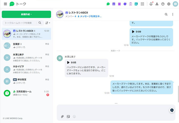 また、フィラーが取り除かれるだけでなく、適切な位置に句読点が挿入されるため、読みやすさが格段に向上している。会話内容はリアルタイムでテキスト化され、LINE WORKSのトークルームに残るため、後から内容を確認する際にも簡単。情報の正確性も向上し、聞き間違いによる作業ミスの防止にも役立つ。