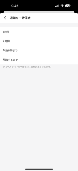 まずは、設定画面から「通知設定」を開く。「通知を一時停止」をタップすると、1時間/2時間/午前8時まで/解除するまで、の4つから通知を切る時間を選択する。作業に集中したいときは1~2時間、就業後に朝までゆっくり過ごしたい場合は午前8時までを選ぶとよい。休日なら「解除するまで」が便利だが、出勤時に通知設定を元に戻すことを忘れないようにしよう。