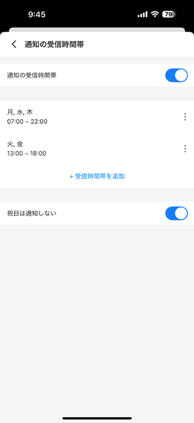 「受信時間帯を追加」をタップすれば、曜日ごとに異なる時間帯を設定することも可能。祝日が休みの人なら、「祝日は通知しない」のスイッチをオンにしておいてもいい。