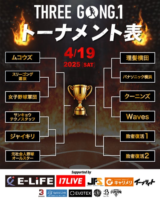 4月19日(土)に横山公園野球場にて開催される「THREE GONG」第1回大会の参戦チームが決定しました。さらにライブ配信アプリ「17LIVE(イチナナ)」での配信も決定!最新情報をお届けします。