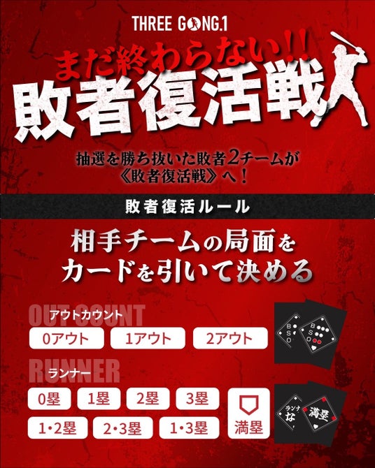 1回戦・2回戦で敗退したチームから抽選で2チームが敗者復活戦の挑戦権を得ることができます。さらに、敗者復活戦は、相手チームの局面をカードで決定する特別ルールを適用し、通常の試合以上に運が試されます。