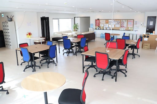 当店はモノレール「安里駅」から徒歩5分の好立地にある、全面ガラス張りの開放的なコワーキングスペースです。白を基調とした明るい室内に、赤と青のチェアが印象的なオープンスペースが広がります。