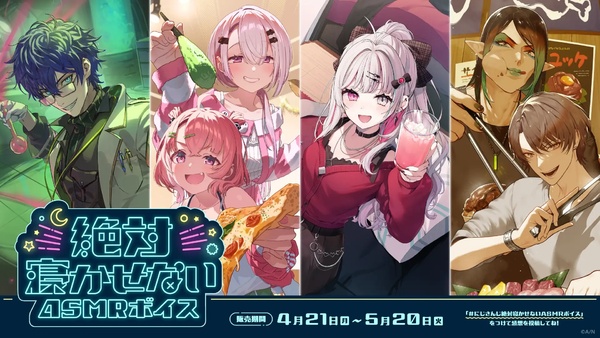 ANYCOLORは4月14日、バーチャルライバーグループ「にじさんじ」による「絶対寝かせないASMRボイス」を発表した。2025年4月21日11時に発売する。にじさんじオフィシャルストアおよびNIJISANJI EN Official Storeで購入できる。4種類のボイスが用意され、価格は各編2500円。