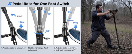 ベースの専用ペダルを踏むだけで自由回転→軽く踏み直せば中央固定。手を使わずに角度調整可能で、動画撮影やスポーツ中継など「瞬間の切り取り」に最適!