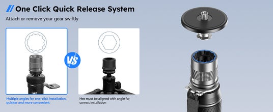ヘッド/脚部に独自の押し込み式リリース機構を採用。カメラや雲台の交換が「カチッ」ワンアクションで完了。マルチ機材運用時もタイムロスゼロ!