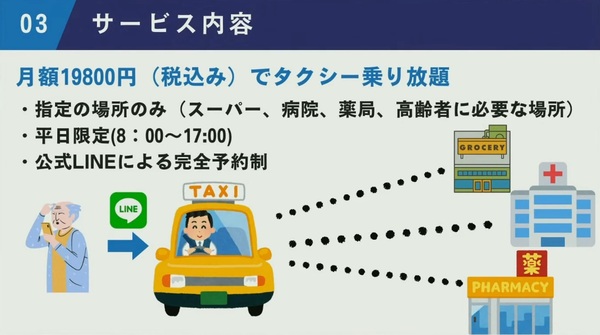平日8時から17時まで、行先は医療機関やスーパーなど高齢者の生活に必要な場所のみの乗り放題で月額19800円を想定している。売り上げはこのサブスク料金と地域の介護施設など高齢者向け事業を展開している事業者からの協賛金の2本立てとなっている。