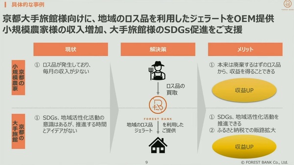 例えばフォレストバンクは地域のロス品を買い取り、賞味期限のないジェラートを製造して大手旅館にOEM提供している。この事例では農家が新たな収益を得るだけでなく、大手旅館の側にもふるさと納税などを通じた新たな商品を獲得できることやSDGsや地域活性化活動への参画をアピールできるというメリットがある。