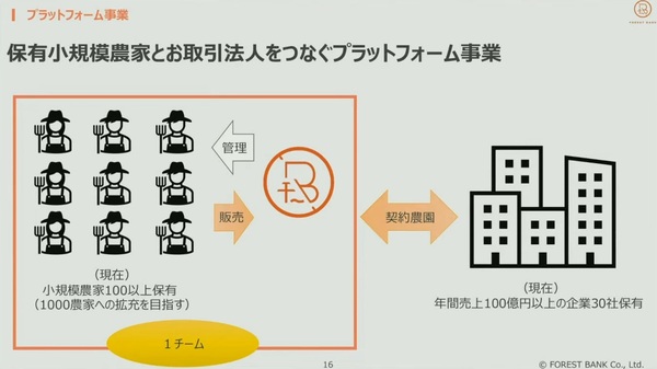 そこでフォレストバンクが取引のある小規模農家を束ねることにより、大手企業との契約を成立させるプラットフォーム事業にも中長期計画の1つとして乗り出そうとしている。これも小規模農家が収益を安定させるためのスキームとして有効だろう。
