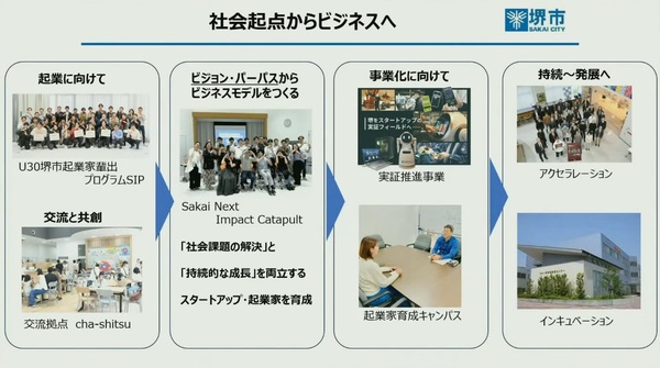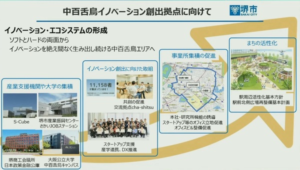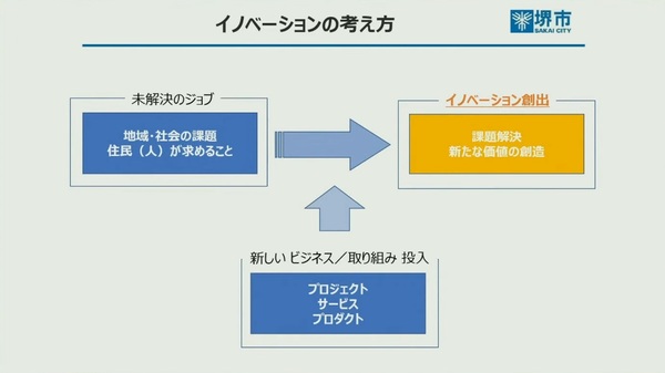 「堺市は基本計画で『未来を創るイノベーティブ都市』を掲げており、そのKPIとしてイノベーション創出につながる事業件数を5年間で100件と設定した。イノベーションと一言で言っても難しいが、一番大事なのが地域や社会の課題、住民が求めているものを新しい製品やサービスを生み出すことで解決し、地域が変わり、新しい価値が創造されることだと思っている。我々はそのようなイノベーションに向けて、多くの事業者の製品やサービスの開発をサポートしている。