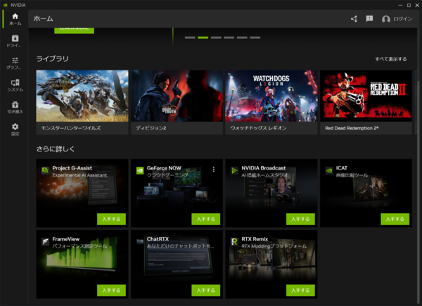 ディープラーニングを利用した、超解像・アンチエイリアス技術「DLSS(Deep Learning Super Resolution)」と「DLAA(Deep Learning Anti-Aliasing)」はその代表例だ。そのほかにも、ビデオ通話における背景除去や音声のノイズ除去を行う「NVIDIA Broadcast」や、ローカルLLM環境を構築する「Chat with RTX」といったアプリもリリースしている。