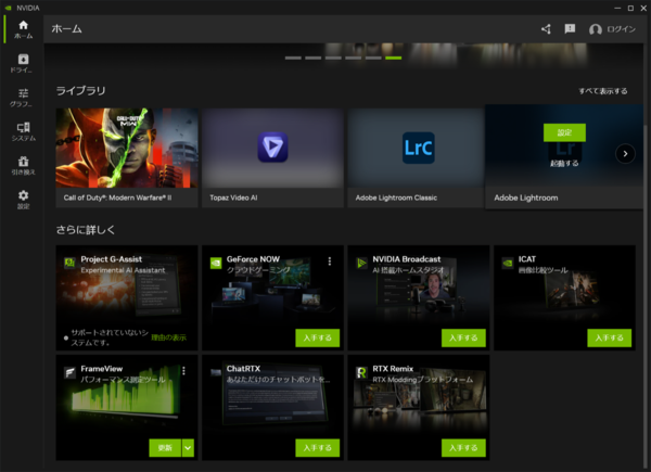Project G-Assistの動作要件は高い。GPUは当然GeForceで、VRAM 12GB以上を搭載したRTX 30シリーズ以降のカードが必要である。つまり、RTX 3070は対象外だが、RTX 3060のVRAM 12GB版は導入できるという意味になる。GeForceドライバー「572.83以降」とNVIDIA Appも必須だ。
