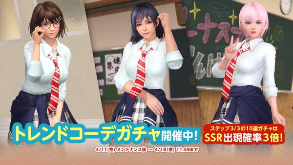 過去に登場した12人の女の子のSSR水着「春彩のスクールウェア」が2種類のガチャで登場。登場するSSR水着は「春彩のスクールウェア」のみとなり、SSRの出現確率は3.3%となっている。