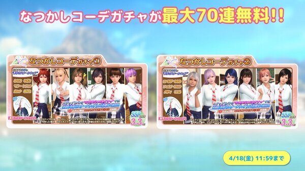 過去に登場した12人の女の子のSSR水着「春彩のスクールウェア」がなつかしコーデガチャで再登場。期間中、なつかしコーデガチャ専用の10連ガチャチケットが毎日もらえるログインボーナスを開催している(最大7日間)。