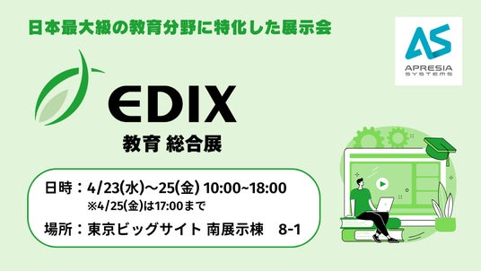 APRESIA Systems株式会社(本社 東京都中央区、代表取締役社長 末永 正彦)は、2025年4月23日(水)~25日(金)の3日間、東京ビッグサイトにて開催される「第16回 EDIX(教育総合展)東京」に出展いたします。