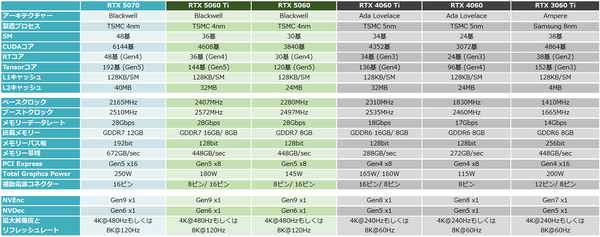 また、RTX 5060 TiやRTX 5060のVRAMまわりの設計に目を向けると、メモリーバス幅は128bitと細いものの、データレート28GbpsのGDDR7を採用することで、448GB/secものメモリー帯域を確保している。RTX 3060 Tiは448GB/secだったが、RTX 4060 Tiでは288GB/secに低下(256bit幅→128bit幅の制限に起因)した。それが再びRTX 5060 Tiで448GB/secに戻るった形だ。