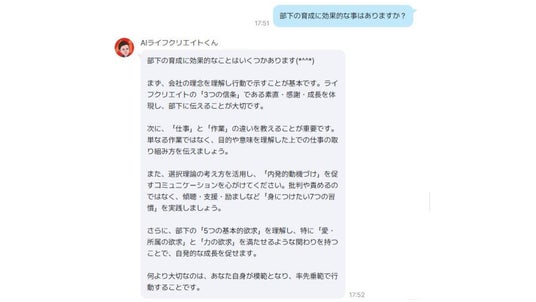 社員が24時間いつでも相談できる存在として、会社の理念やビジョン・価値観を伝えるだけでなく、日々の業務における疑問や悩みにも寄り添います。特に『素直・感謝・成長』という3つの信条や『7つのフィロソフィー』を実践する上でのヒントを提供してくれることを期待しています。