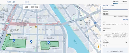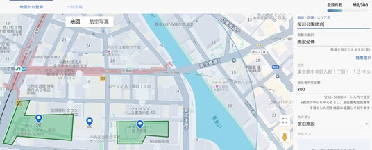 3.選択した複数施設のエリア範囲が地図上に表示された状態で施設登録画面へ遷移