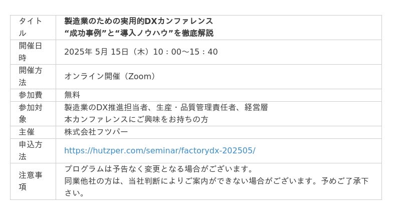 株式会社フツパー(本社:大阪府大阪市、代表取締役 CEO:大西 洋)は、製造業DXの実践に役立つ最新事例と導入ノウハウを紹介する「製造業のための実用的DXカンファレンス」を2025年5月15日(木)にオンラインにて開催いたします。