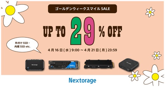 Nextorage株式会社(ネクストレージ株式会社、代表取締役:本多 克行、神奈川県川崎市)は、2025年4月16日(水) より開催される先行セール、2025年4月18日(金)より開催されるAmazon ゴールデンウィーク スマイルSALEに、SSDなどのゲーミング製品で参加することをお知らせいたします。