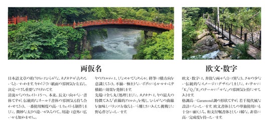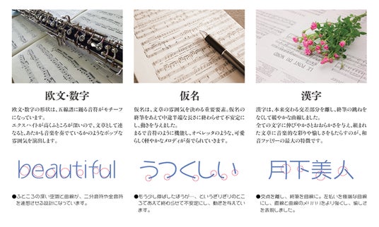 オールドなイメージを残しつつも、その概念にとらわれず大仮名に設計。他の書体にない、横方向の流れを意識した筆致で、近代的な組版にも対応するマルチさを備えています。