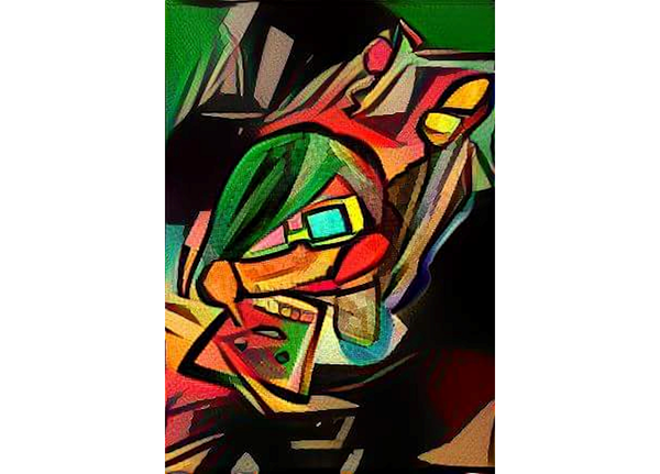 当時のやりとりを見ると、石田さんは、相応にハイパフォーマンスなGPU搭載をマシンを何日間にもわたってブン回してくれたらしい。その結果が、次の画像である。これは、私のオリジナルのアイコン画像と一緒に「ピカソ風」になるべくピカソの画風を研究して描かれた作品をスタイル画像として与えたのだそうだ。画像サイズは、まだ303×435と小さい。