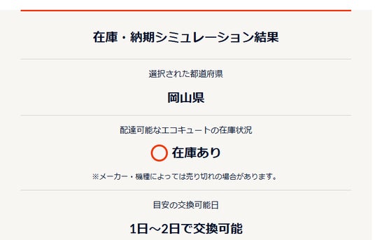 分かりやすい「在庫・納期シミュレーション」:急湯デポのウェブサイトでは、独自開発の「在庫シミュレーション」をご利用いただけます。お住まいのエリア(岡山県)を選択するだけで、エコキュートの在庫状況と交換工事が可能な最短日をリアルタイムでご確認いただけます。
