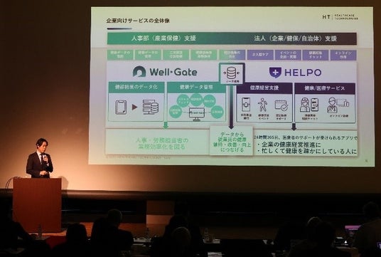 ヘルスケアテクノロジーズ株式会社 代表取締役社長兼CEO 鴻池大介(こうのいけ・だいすけ)氏は、「弊社は、企業向けサービスとして、健診結果のデータ化と健康データ管理を行う『Well-Gate』と、24時間365日医療者のサポートが受けられるアプリ『HELPO』を連携させることで、従業員の健康維持・改善・向上に貢献します。生活者向けサービスでは、『HELPO』を活用し、オンライン診療、健康医療相談、健康管理、ECモール、ポイント活用などのサービスを提供し、生活者のより健康で豊かな生活をサポートすることが可能です。