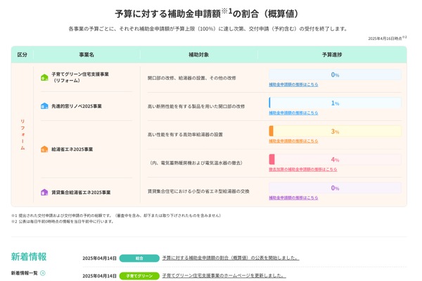 住宅省エネ2025キャンペーン事務局は4月14日、子育てグリーン住宅支援事業、先進的窓リノベ2025事業、給湯省エネ2025事業、賃貸集合給湯省エネ2025事業について、予算に対する補助金申請額の割合(概算値)の公表を始めた。毎日午前0時時点の情報を当日午前中に発表する。ただし、子育てグリーン住宅支援事業(新築)については、交付申請の受付開始に合わせて公表する予定。