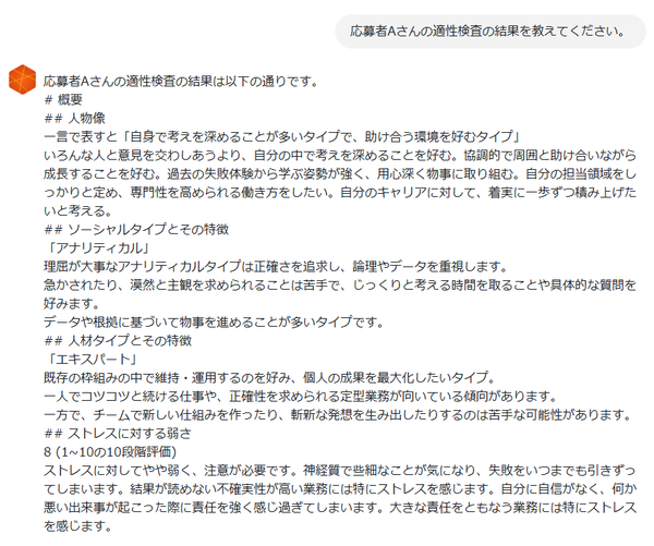 「AIアシスタント機能」は、生成AIを用いた対話型のアシスタント機能。採用や配置、離職、コミュニケーションといった幅広い人事に関する課題についてAIに相談できる。また、性格適性検査の受検者の情報をAIに読み込ませることで、性格や価値観の特性、コミュニケーションの取り方などについても、具体的なアドバイスを行うとのこと。受検者のデータは最大3名まで読み込み可能で、相性の比較やミスマッチが起きそうな部分を事前にAIに相談することも可能だという。