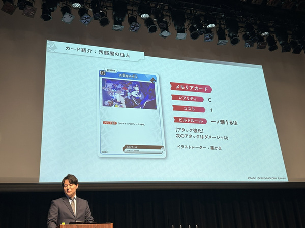 メモリアカードは、アタックカードを強化したり、カードをドローしたりという効果を持つカード。例えば、一ノ瀬うるはさんが描かれた「汚部屋の住人」は、アタックカードのダメージ+60を与える効果を持つ。