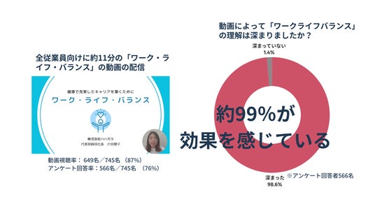 株式会社ハハカラ(本社:東京都品川区、代表取締役:片田櫻子)は、昨年度、従業員数700名規模の企業に向けて提供したライフワークバランス動画研修において、受講者の98.6%が「理解が深まった」と回答したことをお知らせいたします。