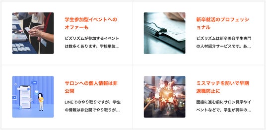 採用活動支援:ビズリズムは、新卒美容学生専門の人材紹介サービスです。専属キャリアサポーターが、学生の履歴書対策や面接対策をサポートし、よりよい就職に向けたブランディングの場を提供します。