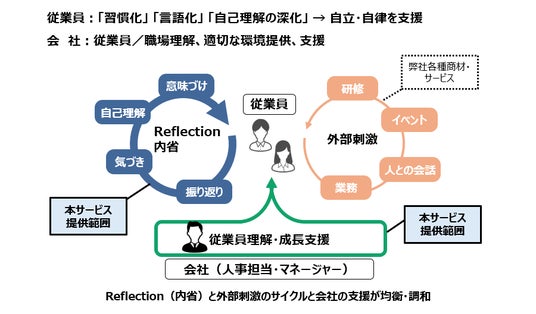 今回、リリース(β版)する“GrowNavi Reflect”のテストマーケティングを当社グループ以外の企業・団体においても実施いたします。 今後、本テストマーケティング結果をサービス仕様や機能開発へ反映し、6月下旬に商用化リリースを予定していることから、詳細な情報やご案内は引き続きご提供してまいります。2.“GrowNavi Reflect”と当社研修・サービスのソリューション展開