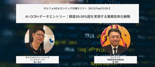 モルフォグループにおいてAIの事業化を担う、株式会社モルフォAIソリューションズ(所在地:東京都千代田区、代表取締役:古川 祐督、以下 モルフォAIS)は、株式会社カンテック(所在地:東京都立川市、代表取締役社長:桂 耕史、以下カンテック)と共催ウェビナー「AI-OCRxデータエントリー:精度99.99%超を実現する業務効率化戦略」を、2025年4月22日(火)12:00に開催します。