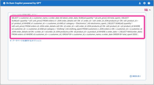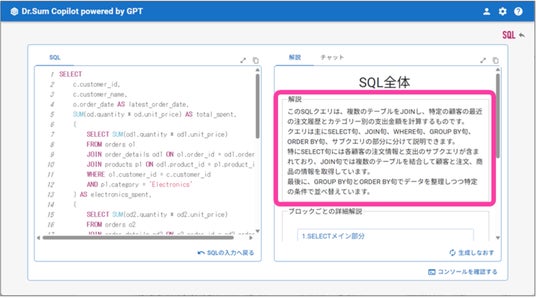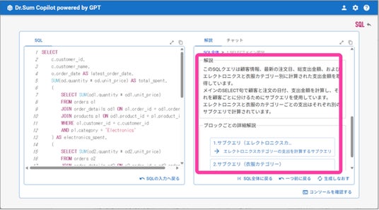 本機能は、データベースの引き継ぎ直後でスキル向上を目指す運用者やSQLの開発に膨大な時間を要している担当者を支援するために開発されました。これにより、「Dr.Sum Copilot」では、自然言語からのSQL生成を行うことに加え、既存のSQLを自動で解析・解説が可能となり業務効率化と属人化の解消に貢献します。