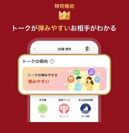 お相手とのマッチ度がわかる人気の「マッチ度機能」に加え、トークの弾みやすさや自身への関心度がわかる2つの新機能も追加!