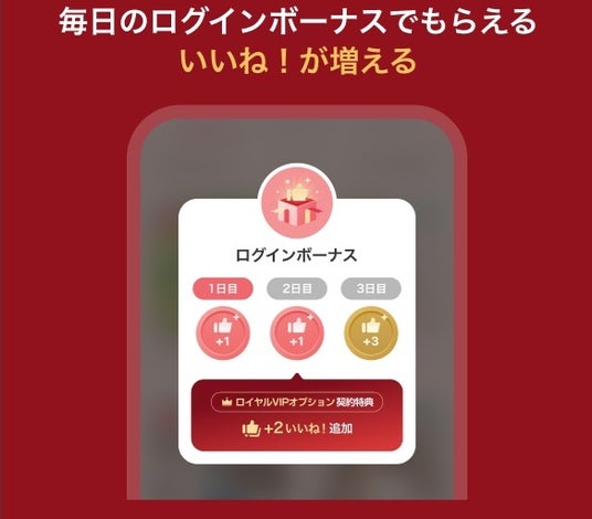ログインボーナスであるいいね!の付与数を現行の「VIPオプション」の毎月2いいね!から毎日2いいね!(30日間で最大60いいね!)に増量、より多くの方にアプローチが可能となり、スムーズなパートナー探しに寄与します。