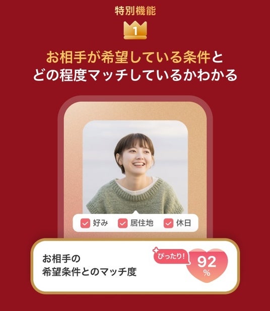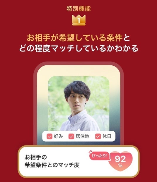 自身のプロフィール情報とお相手が希望している検索条件がどの程度一致しているかを「%」で表示する機能です。