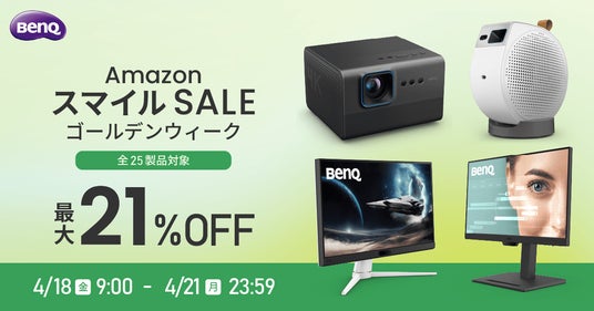 ベンキュージャパン株式会社(本社:東京都千代田区、以下:BenQ)は、Amazonで4月18日(金)9:00から4月21日(月)23:59にかけて開催される「Amazon スマイルSALE ゴールデンウィーク」において、ゲーミングモニターシリーズMOBIUZや4K ホームプロジェクター、天井モバイルプロジェクターを含む25製品※1を最大21%OFF※2にて販売します。