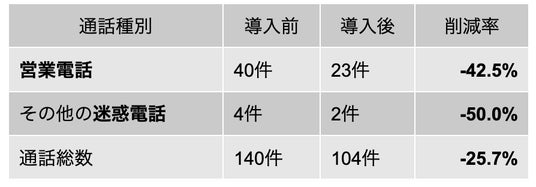 営業電話およびその他の迷惑電話の合計件数は、導入前が44件、導入後は25件。
